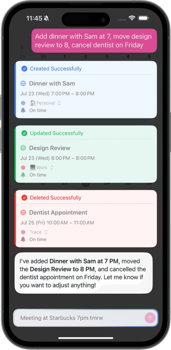 Trace extracts date, time, and context from your command to instantly create or adjust events